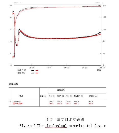 复配好的CZX-928A与进口某与品牌型材稳定剂流变对比如图2,塑化效果更好。